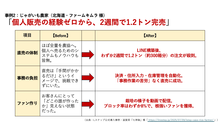 (出典:Lステップ公式導入事例・北海道「ファームアキラ」様「 https://linestep.jp/2025/07/09/lstep-case-rice-farmer/ 」)